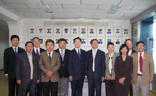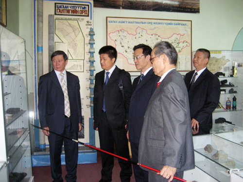代表团受到蒙古科技大学校长Damdisuren Bayanduuren 教授等校领导的热情接待,宾主进行了友好会谈。会谈中,双方回顾了两校建立友好关系以来的交流与合作情况,介绍了各自学校近期的发展,表达了进一步加强合作的愿望,特别就蒙古科技大学派教师进修和派学生攻读学士、硕士和博士学位等问题进修了磋商。蒙古国第一任总统、现蒙古科技大学顾问Punsalmaa Ochirbat参加了会见。会见结束后Damdisuren Bayanduuren校长陪同代表团一行参观了地质博物馆、实验室和校园。