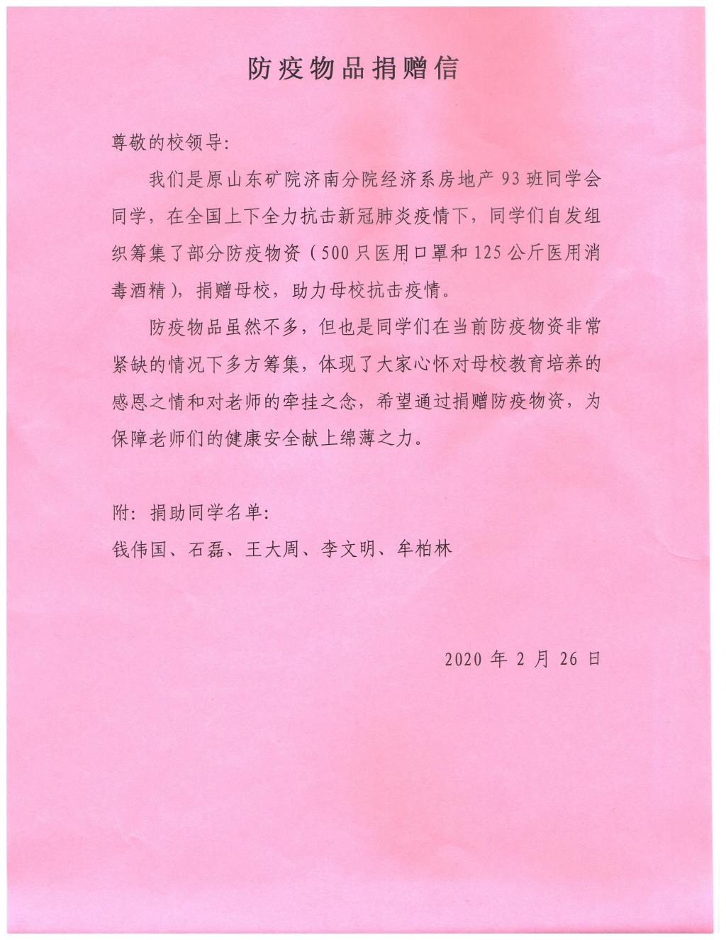 在当前疫情防控物资紧缺的情况下,房地产93班校友钱伟国、石磊、王大周、李文明、牟柏林自发组织,多方筹集了500只医用口罩和125公斤医用消毒酒精捐赠给母校。他们表示在这特殊时期,大家心怀对母校的感恩之情和对老师的牵挂之念,想法设法购买了一些防疫物资捐赠给母校,希望尽微薄之力助力母校疫情防控工作,携手抗击疫情。