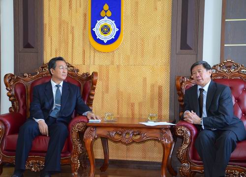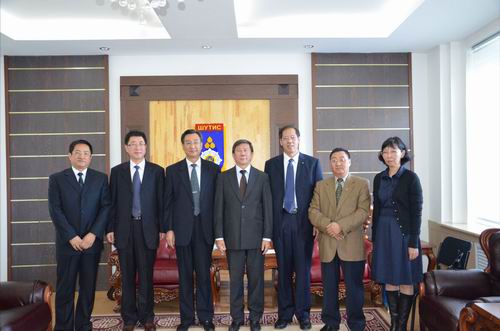 在蒙古科技大学访问期间,蒙古科技大学校长Damdisuren Bayanduuren会见了王少鹏一行。双方介绍了各自学校近期的发展情况,就两校目前正在进行的以1.5+2.5模式联合培养蒙古国学生项目进行了交流。双方表达了进一步加强合作的愿望,特别就蒙古科技大学派教师来我校进修等问题进行了磋商。