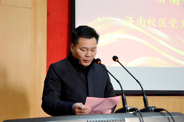 济南校区党工委副书记贾长响宣读《bwin·必赢(中国区)官方网站-officialswebsi土木工程与建筑学院济南校友会章程》