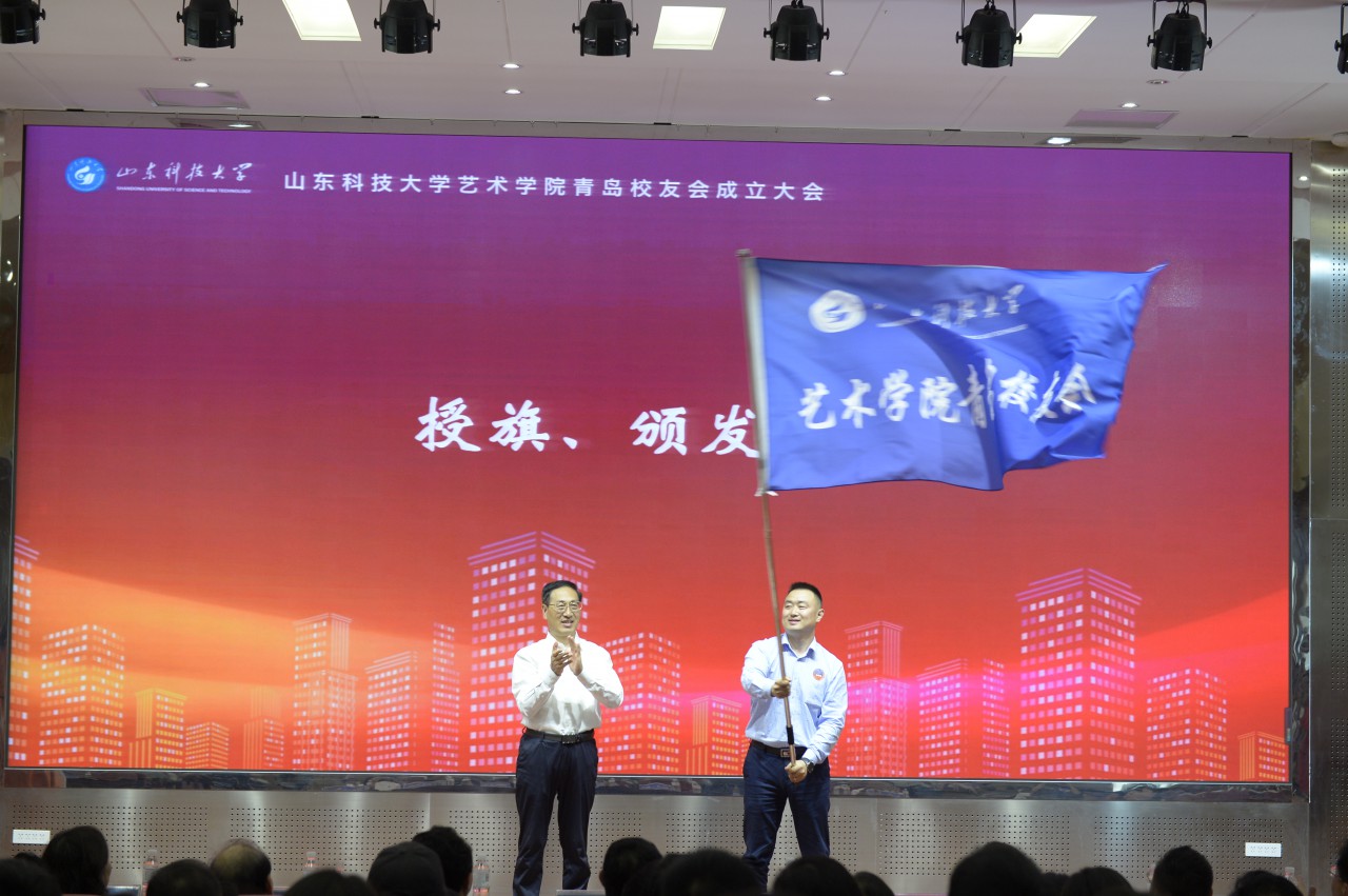 孙鹤汀向艺术学院青岛校友会会长授旗