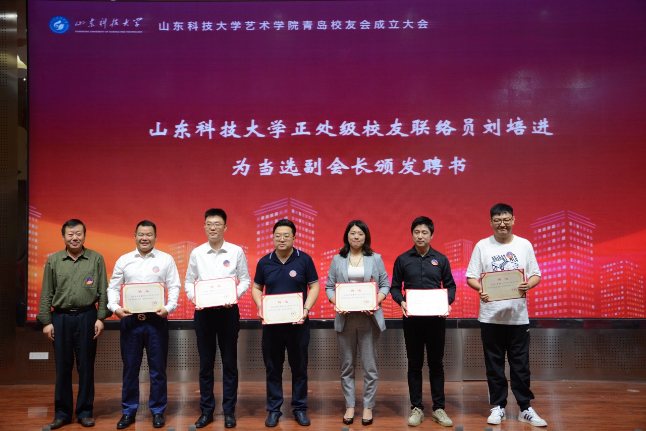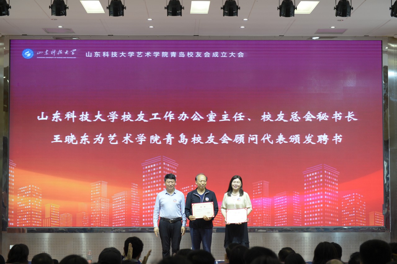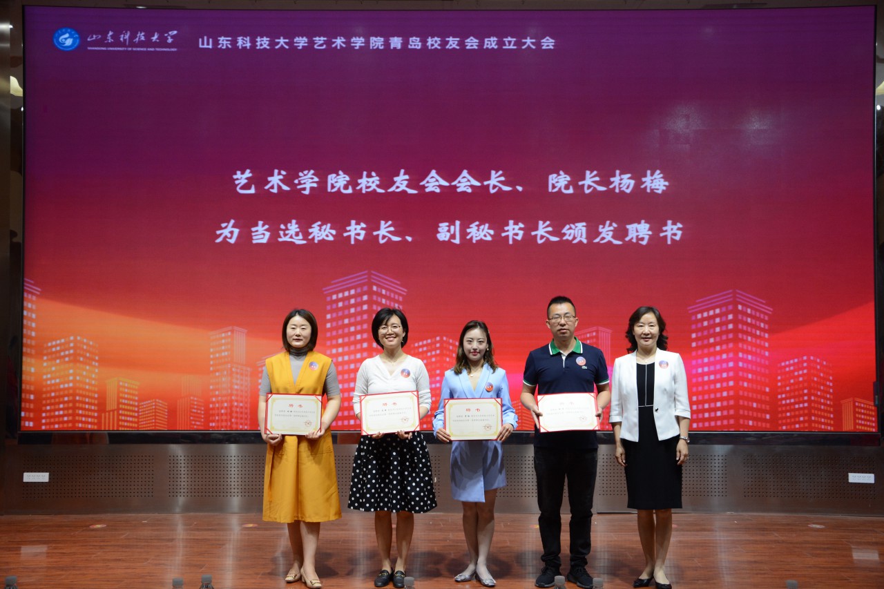 王晓东、刘培进、杨梅、徐志刚分别为当选顾问代表、副会长、秘书长、副秘书长、理事代表颁发聘书。张殿游、金志伟代表地方校友会致贺词。艺术学院教师代表刘寿臣、艺术学院青岛校友会新当选会长徐志刚分别做了发言。