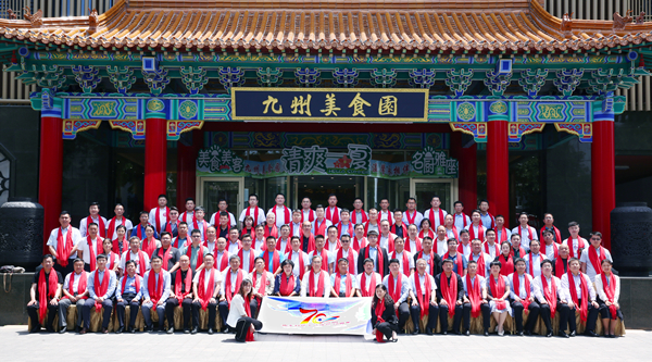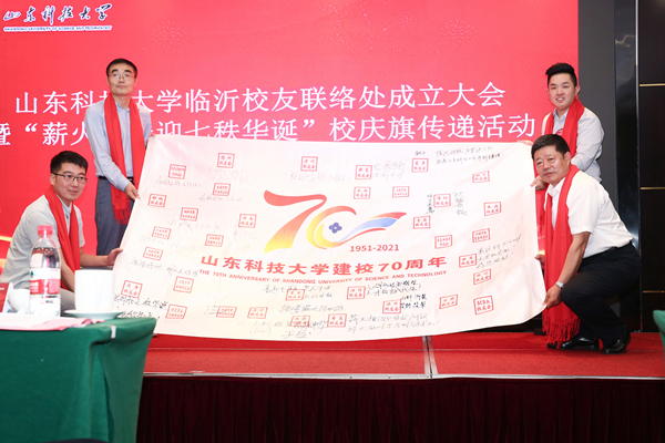 在“薪火相传迎七秩华诞”校庆旗传递活动中,校友许宏宽宣读了《关于开展“薪火相传迎七秩华诞”校庆旗传递活动的通知》,福州校友会秘书长邹训龙、菏泽校友会副会长李建明分别致辞,刘恩功在校庆旗上写下对母校的祝福。