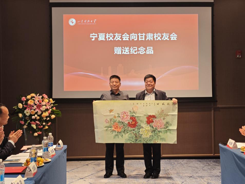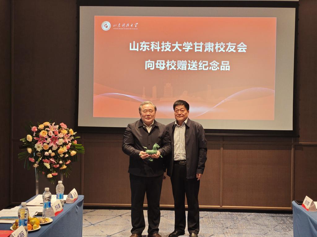 甘肃校友会首届会长、甘肃瑞赛可集团董事长、煤质1989级校友孙建新发言并代表甘肃校友会向母校赠送纪念品,他深情表达了对母校和学校老师们的感恩之情,今后将在校友总会的指导下,与各位校友携手并肩,在陇原大地上搭建一个凝聚情感、汇聚资源、共促发展的平台,将它建设成连接母校的坚实桥梁和甘校友的温暖家园。