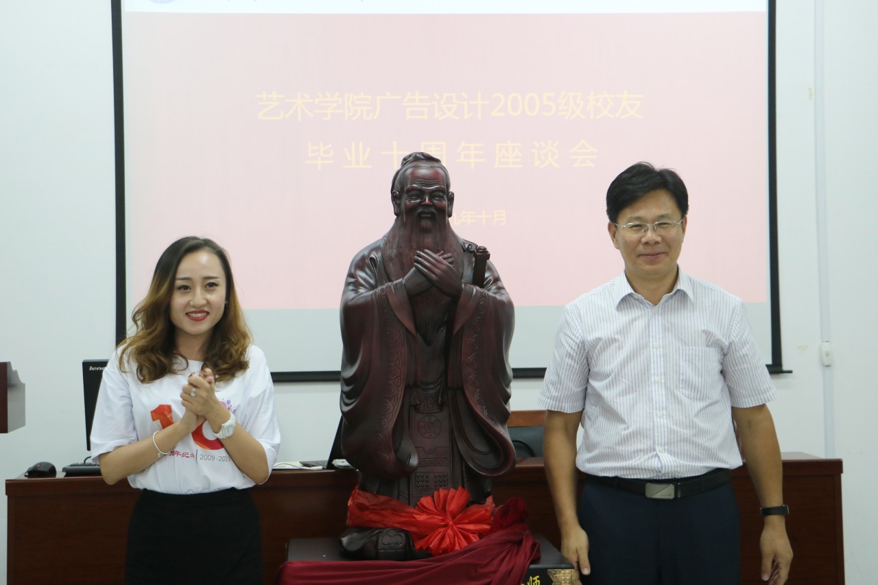 十年来,同学们一直心系母校,关注母校的发展。一位05级广告设计毕业生说道:“在大学里,我成长了许多,母校教给我太多东西,如今,学校及学院的发展,也时时刻刻牵动着我们这些毕业生的心。”随后,毕业生们向曾经帮助、教导过自己的领导老师们献花,表达对老师们的感激之情。最后,由党委书记王凯同毕业生一起为校友赠与的孔子像揭牌留念。