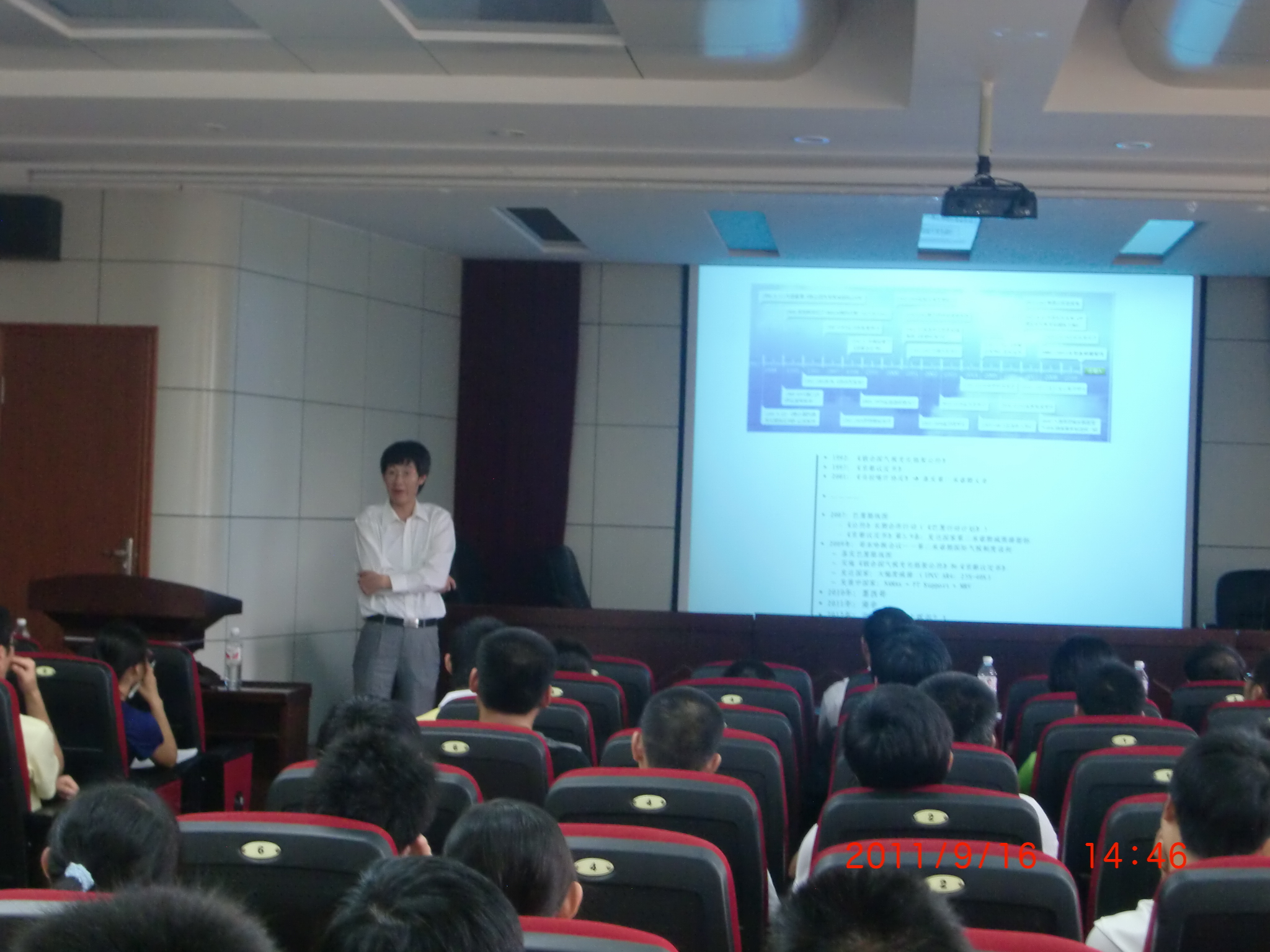 报告会上,首先由周仕学简单介绍了魏伟的研究领域和科研绩。随后,魏伟向同学们作学术报告。魏伟结合近年来部分国家二氧化碳排放情况分析了温室气体对全球变化的影响,并重点分析了二氧化碳的长期排放对我国经济发展的影响,指出哥本哈根会议后中国面临的专项关键科学问题和任务,并结合自己的研究探索出一条中国特色的低碳发展道路。魏伟的讲述使大家对温室气体的影响及低碳减排策略有了更深层的认识。