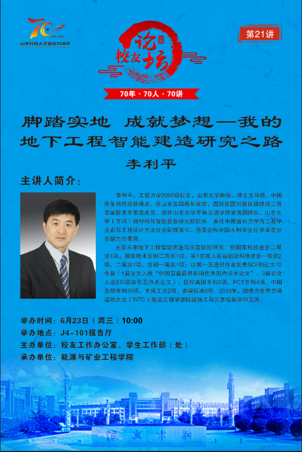 “70年·70人·70讲” 校友论坛第21讲:脚踏实地 成就梦想——我的地下工程智能制造研究之路