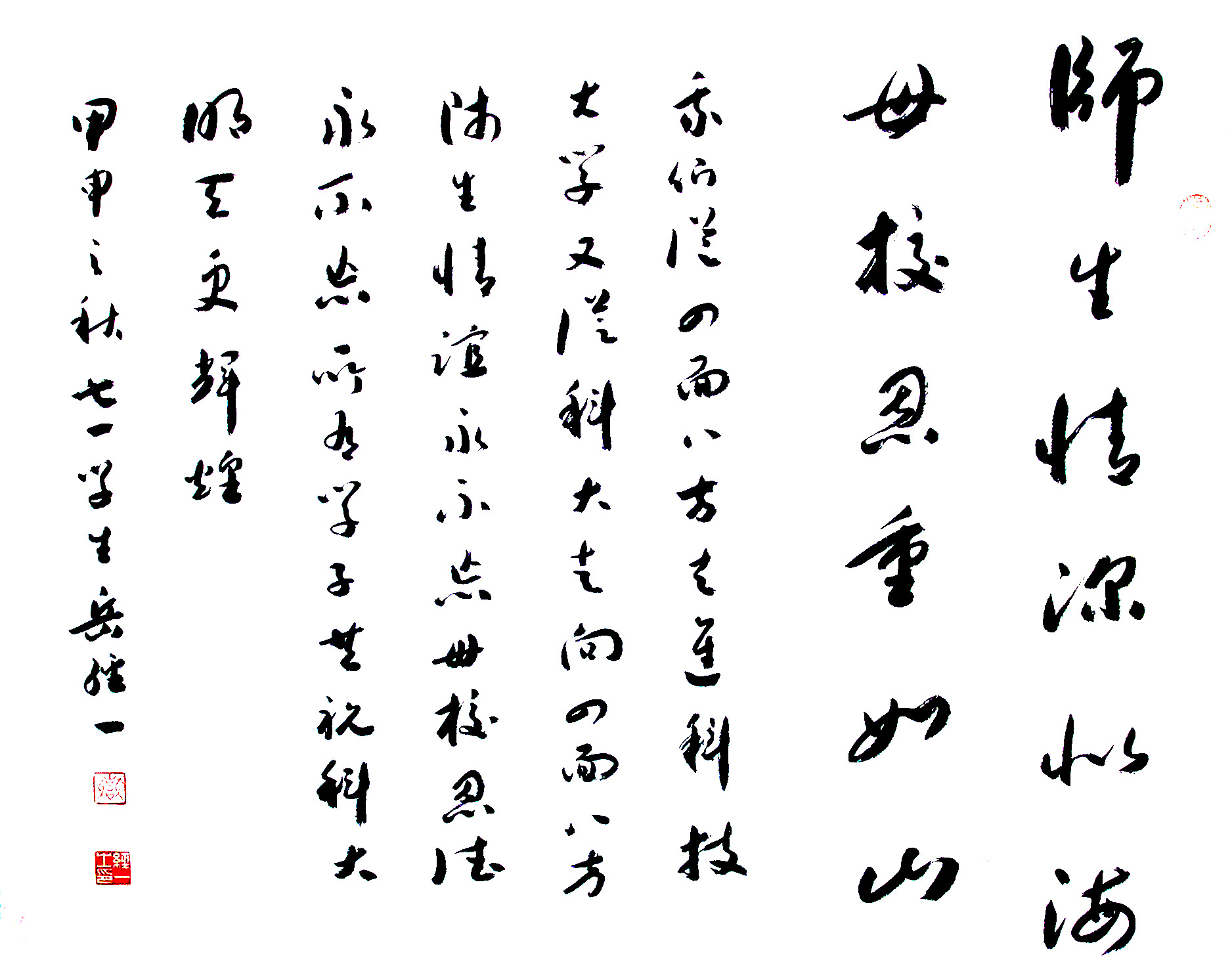 近日,淄博市人大副主任、中国书法家协会会员、山东省摄影家协会会员、淄博市书法家协会和摄影家协会名誉主席、我校71届校友岳经一应邀回母校参观访问。为鼓励校友工作的顺利开展,在校期间,岳经一校友应邀欣然题词。题词全文如下:“我们从四面八方走进科技大学,又从科大走向四面八方,师生情谊永不忘,母校恩情永不忘,所有学子共祝科大明天更辉煌”“师生情深似海,母校恩重如山”