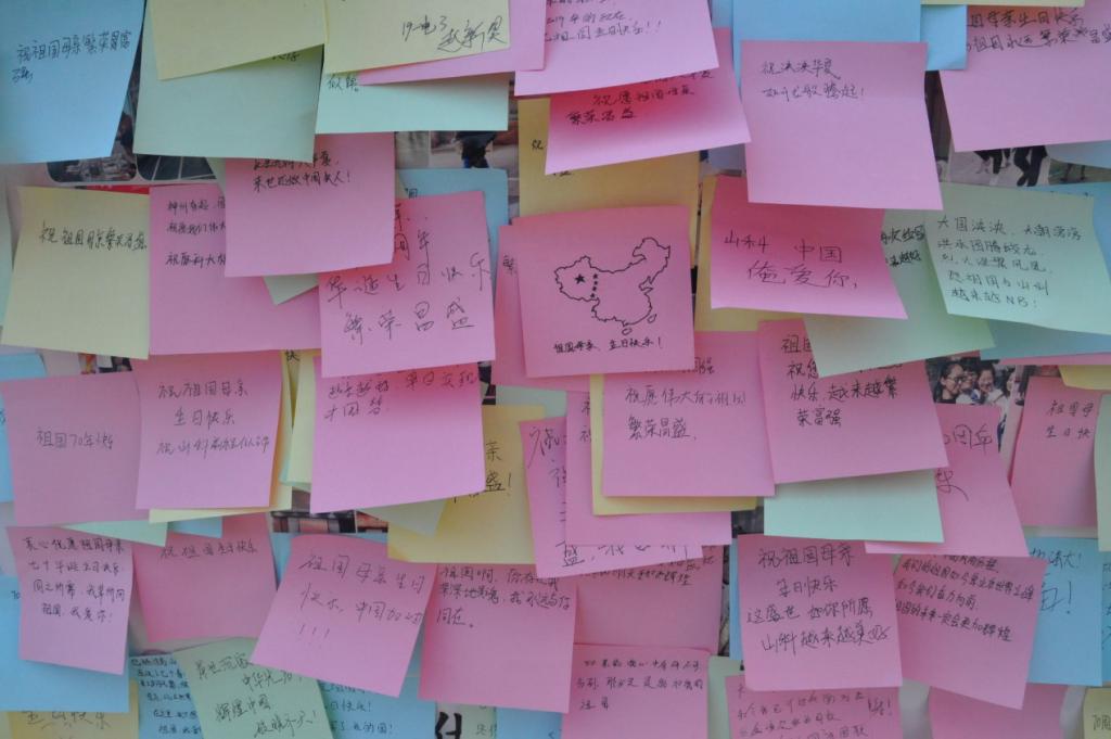 活动于上午10:30在3个餐厅同步开始。活动期间,2000余名师生在便签上写下自己对祖国和母校的祝福。活动结束后,校友工作志愿者们将便签归纳整理,筛选出部分祝福在微信公众号、QQ公众号上进行推送报道。